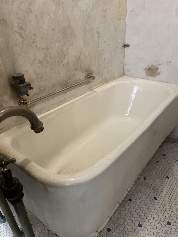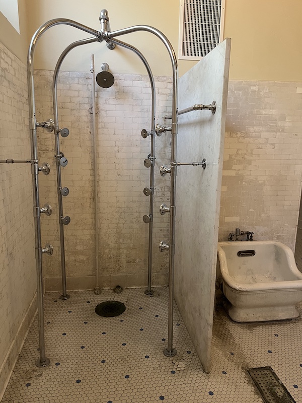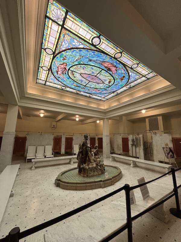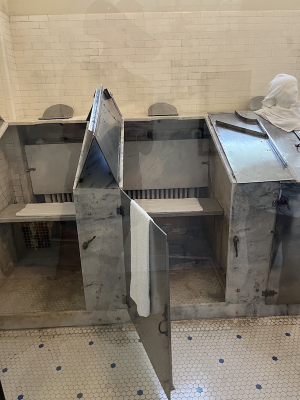 We chose to experience the traditional bath regimen. There were different spaces for men and women, so Scott and I went our separate ways and had different experiences. We both opted to wear bathing suits, but that was not required. We started in a little room where we undressed and placed all our belongings in a locker. I was then wrapped with a white sheet by an attendant. I received a 20 minute bath that ended with a loofah scrub by a different bathing attendant. I was again wrapped in the sheet. My next station was a table I laid on with hot towels on my back, legs, and torso, and a cold towel over my face/neck. Then I went into the hotbox, kind of a personal sauna with steam from the hot mineral water, but closed over your shoulders and your head sticking out (apparently the vapors aren’t great to breathe in). My final station was a little tub for just my bum (it’s on the right in the above photo with the shower – that little porcelain footbath looking thing). The tub was on a bench, my legs went over the side. Scott said his station also had hot water splashing down his back. Along the journey, I was offered water, which was a cup of ice filled with hot mineral water (cooling it off). Scott also experienced these stations, but in a different order. He got the bath, the bum tub, the box, then the table. It’s certainly a throwback to a different era, but we both think experiencing this routine once was enough for us.