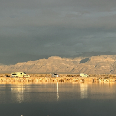 Anyway, other than watching beautiful sunsets over the lake and getting startled by shock waves, we also got the truck fixed mid-week (the “check engine” light warning turned out to be an exhaust issue that was easily repaired in a couple hours) and then yesterday we made the short 13-mile drive over to a KOA in town and had a busy day getting groceries, doing laundry, dumping waste tanks, and refilling water and propane and gas for the truck.