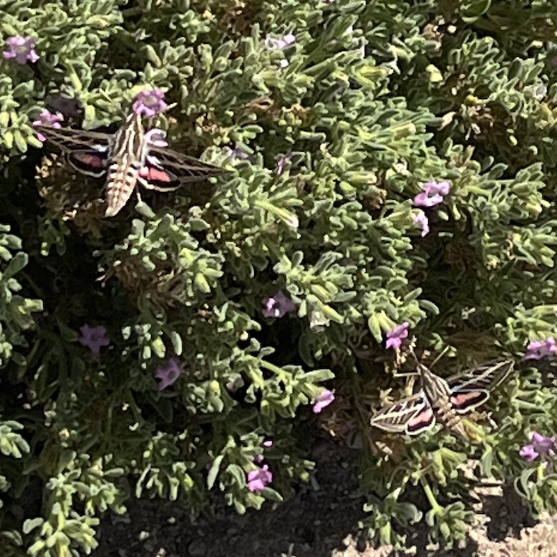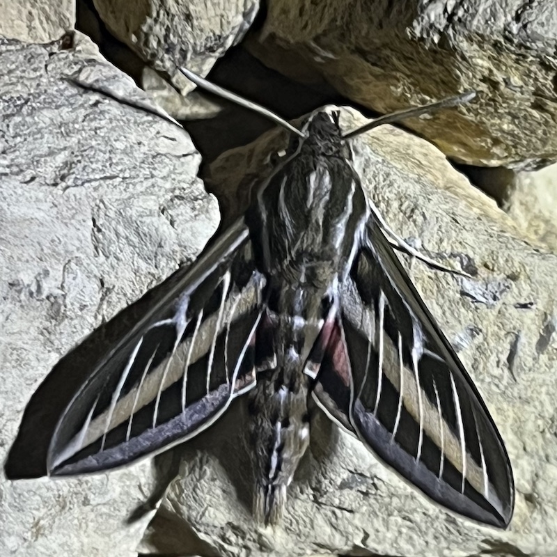Moths are more difficult for me to identify; they don’t have the bold colors most butterflies have, they often only appear at dusk, the patterns are difficult to capture in a photo. BUT we do have moths here. The Sphinx (Obscure and White-lined) are like little hummingbirds (or flying slugs according to our friend Eric), they are big and their wings beat very fast.