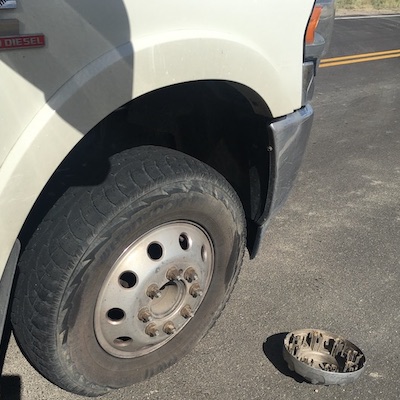 We started feeling some vibrations that didn’t seem right so we pulled off the highway about 60 miles east of our destination for the night.  As we exited and slowed down, those vibrations felt more like a wobble but when we got out to look we couldn’t see anything that was causing the issue.  Everything on the truck and the 5th wheel looked fine to us.  There weren’t any services around (that stretch of I-80 in Wyoming is pretty desolate) so we decided to keep going, but to slow down and limp our way into Rawlins and then try to figure things out there.
